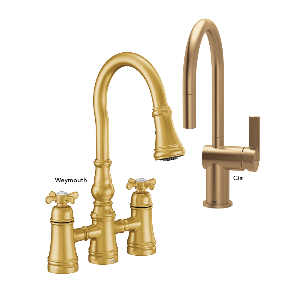The Cia kitchen faucet from Moen combines superior hands-free technology with stunning modern elegance, elevating any space with sophisticated style. Moen’s Weymouth kitchen faucet features distinctive accents including porcelain inlays with Euro-influenced decorative script and signature styling elements to make an extravagant statement in a Traditional kitchen.